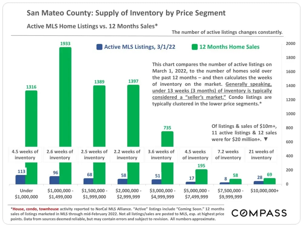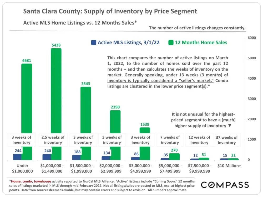 This month we get to look at some of our favorite data from different perspectives. If you follow along with our monthly updates, a limited supply of houses has been a dominant storyline for the last two years (really since coming out of the last recession). If you're looking at a house under $5m in Silicon Valley, all the current inventory would be sold through and replaced in less than a month (2 weeks if you're searching $1.5-2m!) 😳 That is ⚡️ fast. |