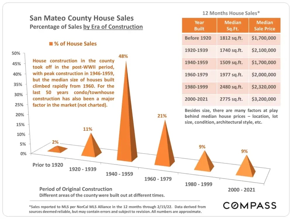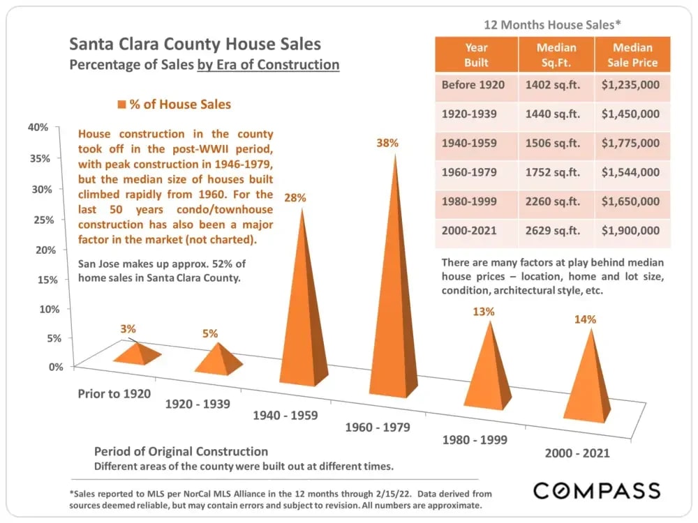 We often look at sales volume in price point tranches, but this month we're looking at the housing inventory as vintages. Of all the houses sold in the last 12 months in Silicon Valley, 69% of San Mateo Co homes and 68% Santa Clara County homes were built in the 30 years post WWII. Only 9% SMC and 13% SCC homes were built between 1980-1999 (are they called millennial houses?) and an equal percentage break down for homes built since the beginning of this century. |