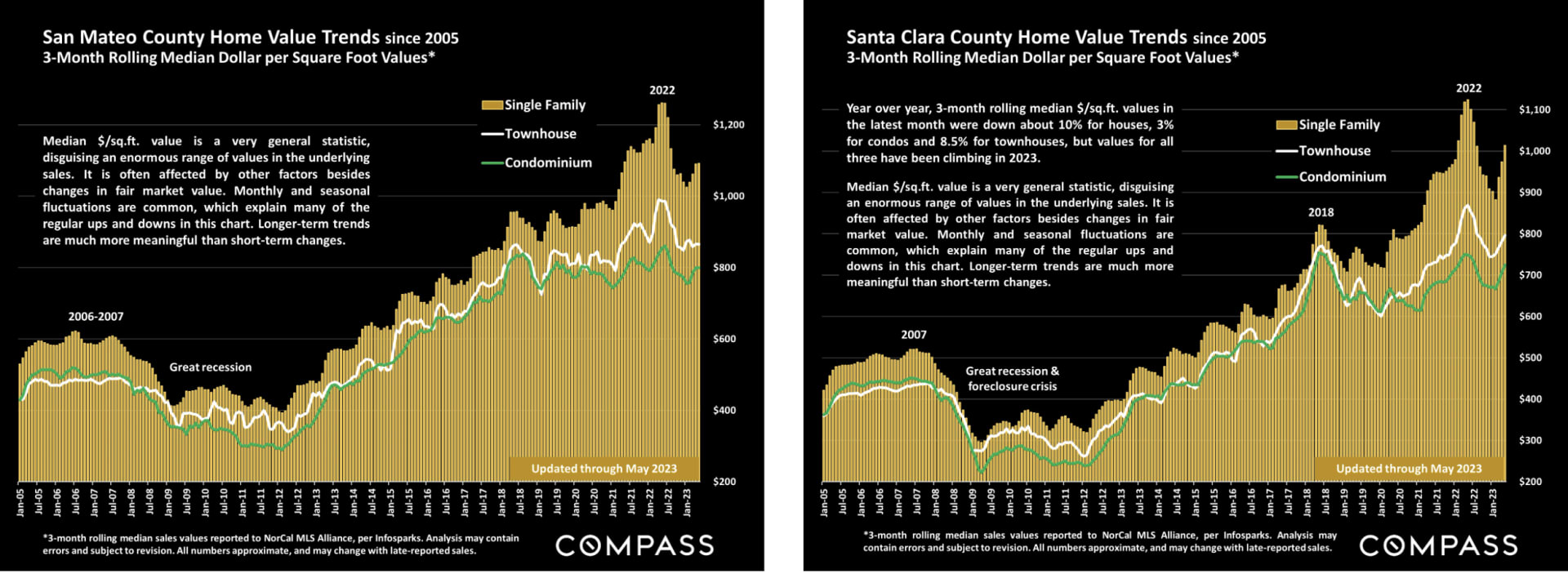 Though we spend more time talking about trends for single-family homes, we have some great data that breaks down the pricing performance of condos and townhouses in our area. Townhouses in both counties are back at their previous peak level from 2018 in terms of $/sqft, while condo prices have stayed relatively flat since 2017.