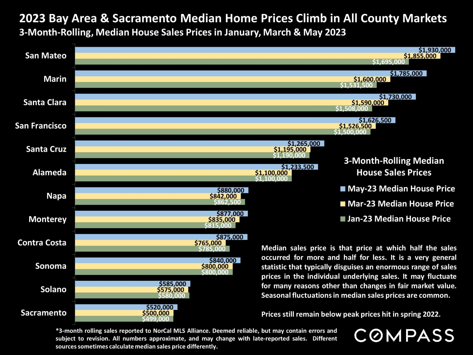 Another side effect of this scarcity has been a bounce in the median price after the slide during the second half of last year. Right now, median prices across counties are back to early 2021 levels.