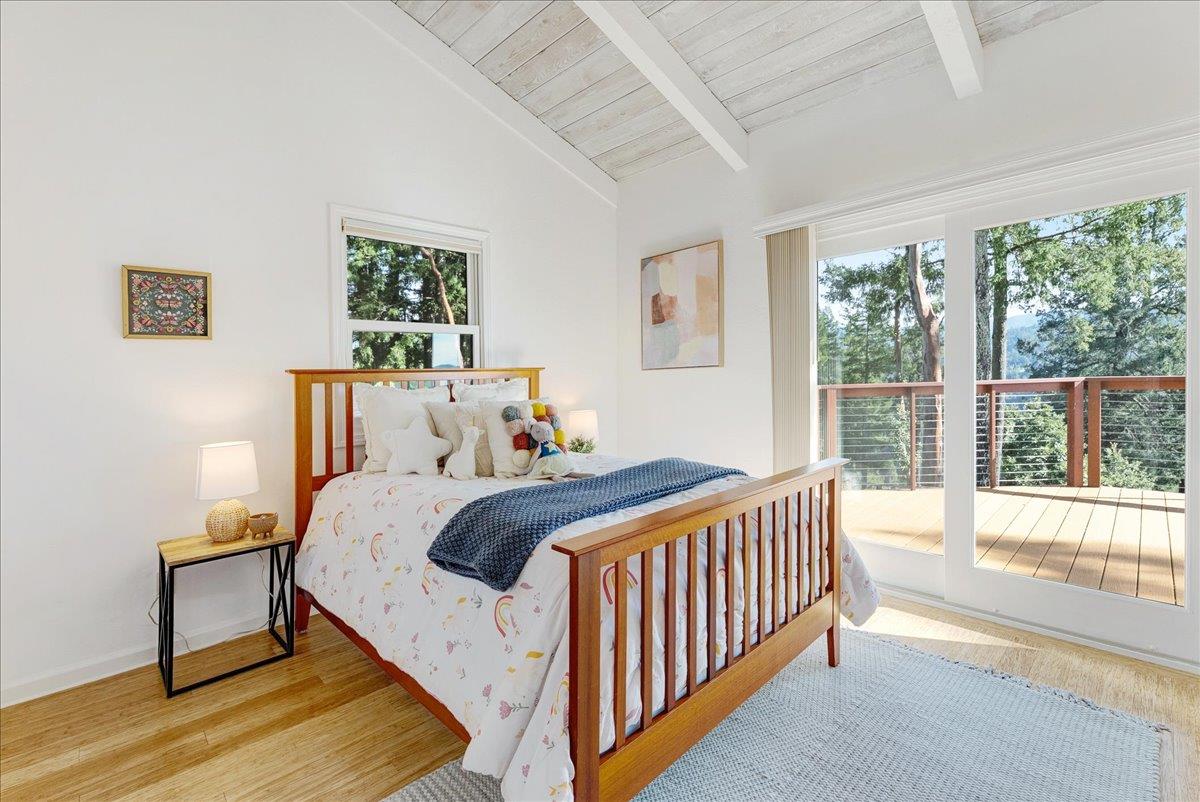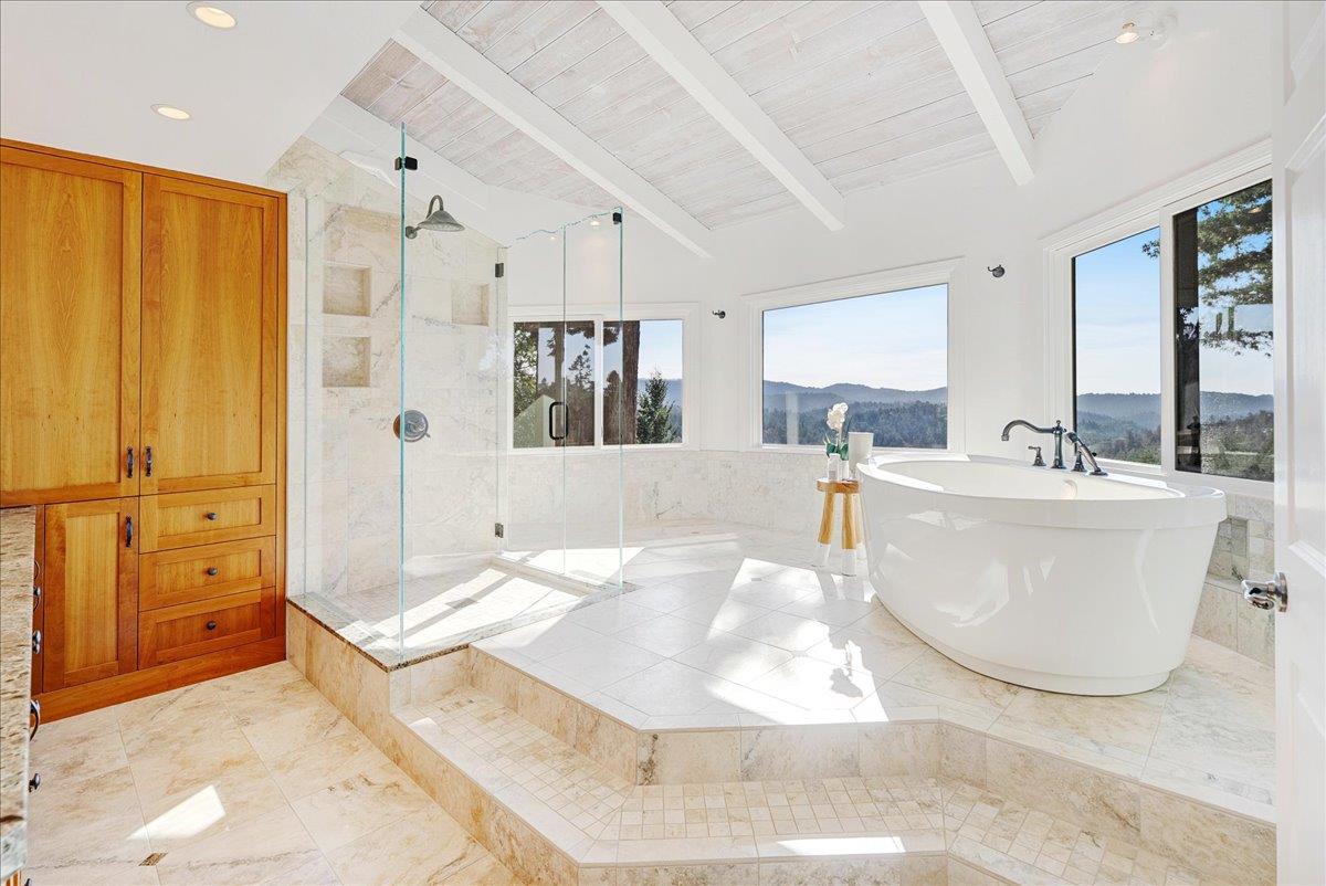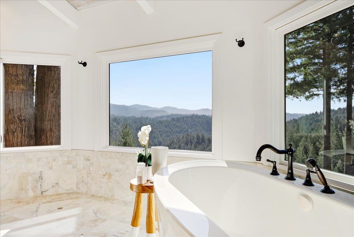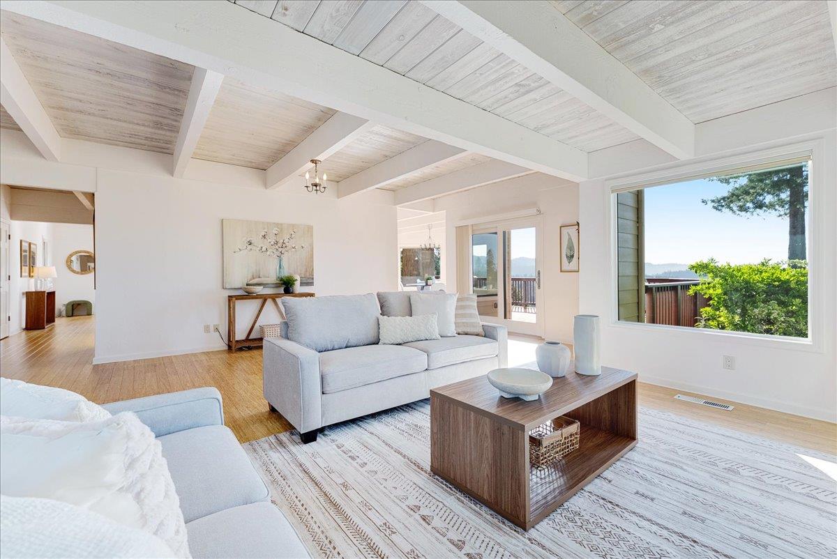 For the buyer who wants to disappear without being disconnected, this extraordinary retreat delivers a rare balance of privacy, beauty, and access. Perched above the treetops with breathtaking 40-mile views, the home lives in harmony with its natural surroundings, offering a true sense of escape just minutes from Highway 17. Expansive picture windows flood the interiors with light and frame sweeping redwood and ridgeline vistas, creating a calm, sanctuary-like atmosphere throughout. The kitchen is warm and inviting, with granite countertops, custom cabinetry, and high-end appliances, flowing seamlessly into an intimate dining area surrounded by panoramic views. The spa-inspired primary bath offers a serene place to unwind, while outdoor living is exceptional. An expansive deck with a hot tub, raised garden beds, and a one-of-a-kind bench wrapped around majestic redwoods creates unforgettable spaces to relax and recharge. Meticulously maintained and thoughtfully improved, this home is ideal for remote work or commuting to Silicon Valley or Santa Cruz, a place to reset, recharge, and live above it all. Not just a home, but a shift in how you live, where space, light, and perspective become part of your everyday experience.